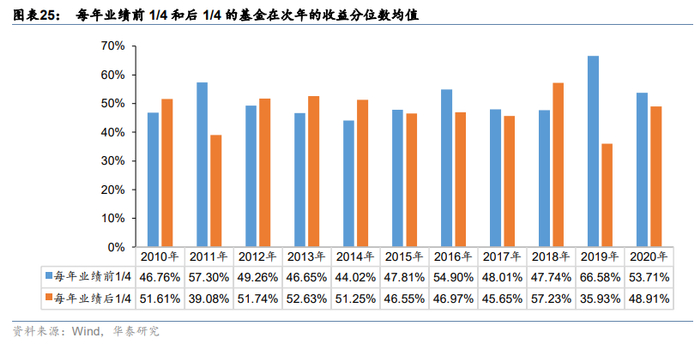 2)统计历年业绩靠前和靠后的基金在之后每年的收益表现。