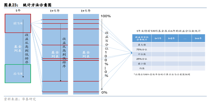 接下来我们探讨历年业绩靠前和靠后的基金在之后每年的收益表现情况。我们将业绩靠前定义为基金在该年的复权单位净值增长率位于同类基金的前1/4水平,业绩靠后则定义为基金在该年的复权单位净值增长率位于同类基金的后1/4水平。观察时间为2010年至2021年,观测方法的计算示意图如下: