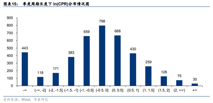 首先以各基金季度业绩为周期长度计算CPR数值。通过统计我们发现,大多数基金的CPR值位于(0,1)之间,即“连赢连输”的数目不如“输赢交替”,但为了更细致地观察CPR分布情况,我们对CPR数值取对数后进行展示: