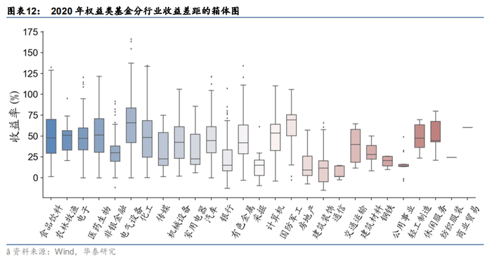 以2020年为例,电气设备行业的权益类基金内部收益差距较大,而通信、钢铁行业的权益类基金收益相当接近。这说明不同行业内部的基金收益差距存在差异。