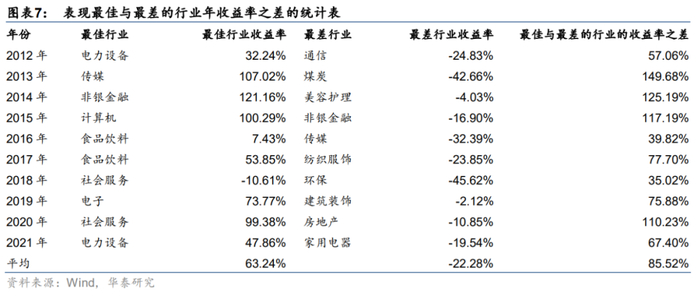 接下来我们采用同样的方法测算股票市场不同行业的收益差距,统计31个一级行业指数在2012年至2021年的年度收益率分布箱体图如下。2018年最佳与最差行业的收益差距最小,为35.02pct;2013年最佳与最差行业的收益差距最大,为149.68pct。每年表现最佳与最差的行业的收益率之差平均为85.52pct,电力设备、社会服务和食品饮料是经常成为获得领先收益率的行业。可见行业与行业之间的收益差距很大,选择正确的行业对获得更高的收益具有重要意义。