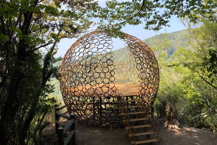 在小豆岛,擅长以铁为媒介创造空间的艺术家青木野枝完成了《空之玉》的创作,登上寒霞溪的高峰,可以站立在铁铸的球形瞭望台上感受濑户内海的治愈。