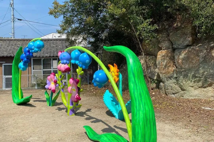 在犬岛,艺术家大宮恵里子在人们跳盂兰盆舞的广场,把岛上的花变成了巨大的“花精灵舞者“,带来全新作品《INUJIMA艺术约会》,人们可以走近触摸这些花朵,发现藏在叶片背面的心思。
