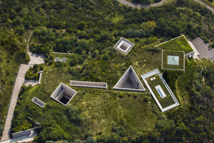 他把选址放在了山谷底部,尽可能保留了现有的地形和树木,充分利用原址的潜力,整座建筑由棱角分明的钢造屋顶和梯形造型的半户外混凝土组成。钢造屋顶像折纸般折出了两个三十度角的开口,自然光线悄然入室,四季之感也透过两个开口变得敏感而共情。