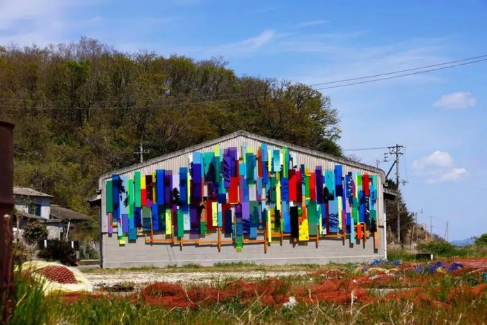 在男木岛,壁画家真壁陆二带来了新作《男木岛小巷壁画计划 wallalley /涟之家》,在艺术家眼里,海洋是五颜六色的,他在渔港仓库的墙壁上贴满了不同颜色的亚克力板,展出期间还会邀请观众一起参与创作,描绘一座彩色的岛屿。