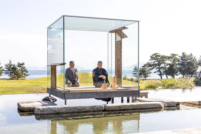 《闻鸟庵》的设计灵感来自日本茶师千利休“和、敬、清、寂”的茶道思想,开放的庭院、封闭的玻璃盒,看似外形简单的茶室,实则富有深刻的哲学意义,杉本博司借此预示了“一个能听见鸟声的优雅的房子”。曾在威尼斯、京都展出的《闻鸟庵》,此番会把那份“漂流的优雅”送给直岛那片海。