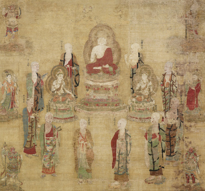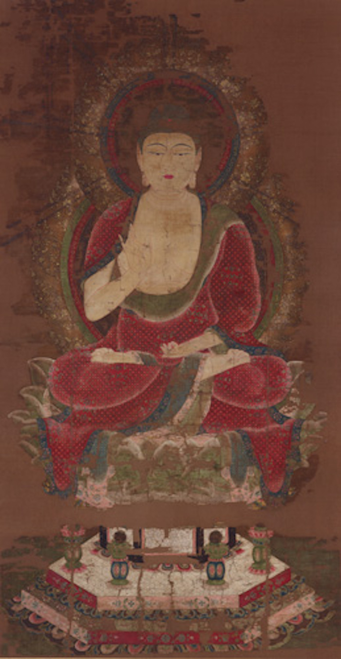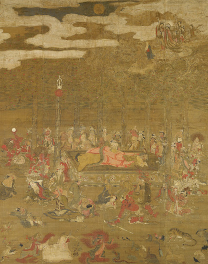 这一幅作品展现了释迦牟尼在沙罗双树下涅槃的情景。本图的画家·专有隶属于兴福寺,作为大安寺绘所的绘佛师,也负责制作受兴福寺影响的大安寺佛画。