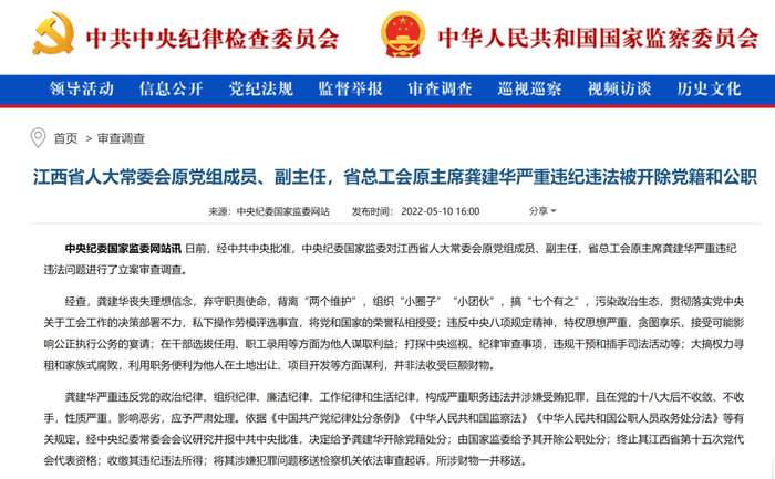 5月10日下午4时,中央纪委国家监委网站发布消息:江西省人大常委会原党组成员、副主任,省总工会原主席龚建华严重违纪违法被开除党籍和公职。