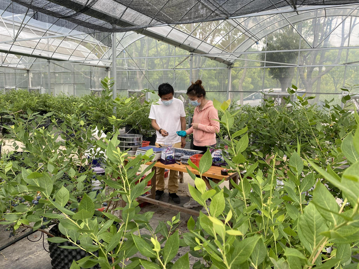 随着立夏节气的到来,沪郊不少水果都开始大批量上市了。但对于一些以采摘游为主的小众水果,在销售上就遇到了问题。日前,记者来到金海公路喜呈果蔬(上海)专业合作社的蓝莓采摘园,大棚内弥漫着浓浓的果香味,蓝莓果实已经大片成熟,一串串、一颗颗蓝紫色的果实挂满枝头,成熟小巧圆润的果实表面都裹着一层白霜,十分诱人。