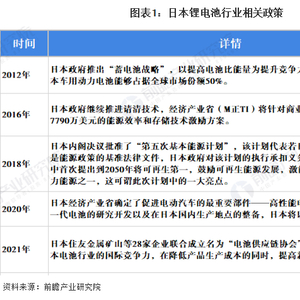 日本政府机构NEDO自上世纪80年代开始对锂离子电池的研发给予长期稳定的支持,制定了动力蓄电池研发路线图和行动计划,着重对锂离子动力蓄电池单体、模块、标准、评价及关键原材料进行研发攻关。具体的锂电池行业规划出台于2012年,日本政府推出“蓄电池战略”,指出行业发展以提高电池比能量来提升竞争力;2016年开始,日本开始以财政政策推动锂电池行业的发展,2020年,日本以补助金的形式推动高性能电池开发;2021年,随着电池供应链协会的成立,日本电池技术有望迎来新的突破。