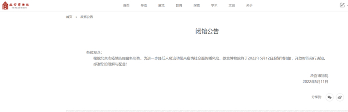 故宫博物院:12日起暂时闭馆 央视 2022.05.1114:24 关注 根据北京市疫情防控最新形势,为进一步降低人员流动带来疫情社会面传播风险,故宫博物院发布公告将于2022年5月12日起暂时闭馆,开放时间另行通知。