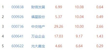 其中,财信发展、福星股份、中交地产、万业企业、光大嘉宝位列板块涨幅前五位,涨幅分别为10.08%、10.04%、10.00%、9.17%、6.64%。