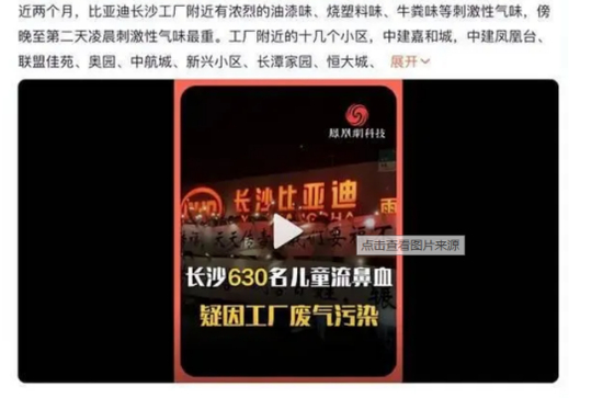 2022年5月7日,一则“比亚迪工厂污染疑致多名儿童流鼻血”的消息登上热搜。