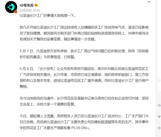 根据新浪微博的大V“42号车库”梳理,此前比亚迪长沙工厂周边就已有居民拉横幅投诉。因对答复不满,事件才进一步发酵。