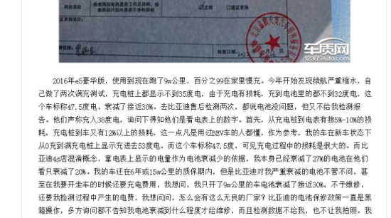 车质网编号【733690】显示:2016年e5豪华版,使用到现在跑了9w公里,百分之99在家里慢充。今年开始发现续航严重缩水,自己做了两次满充测试,充电桩上都显示不到35度电,由于充电有损耗,充到电池里不到32度电,这个车标称47.5度电,衰减了接近30%。
