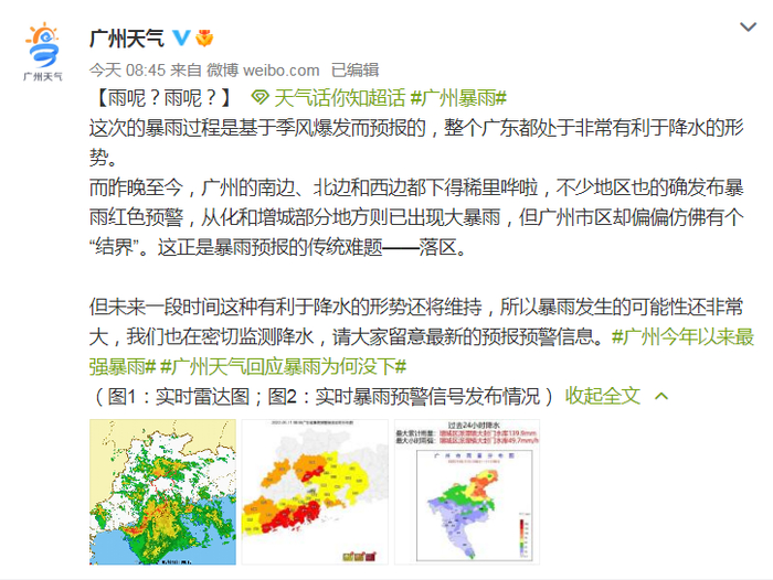 对于网友关心的“广州暴雨为何没下”的问题,@中国天气 11日中午发文称“广东暴雨确实来了,但雨水分布不均匀”。此外,文中还提到: