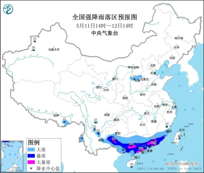 预计,5月11日14时至12日14时,广西西部和中南部、广东大部、福建中南部以及贵州西南部、云南东南部等地的部分地区有大到暴雨,其中,广东南部和中东部、广西西部和东南部等地的部分地区有大暴雨(100~180毫米),局地特大暴雨。上述部分地区伴有短时强降水(最大小时降雨量40~80毫米,局地可超过100毫米),局地有雷暴大风等强对流天气。