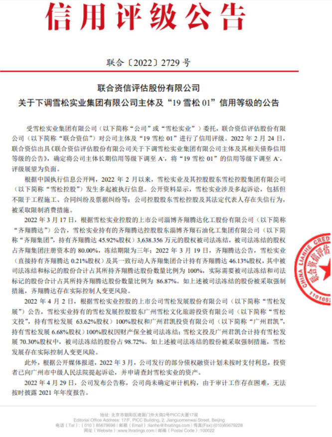 因此,联合资信认为,上述事项对雪松集团的资产流动性、再融资能力及偿债能力产生重大不利影响。