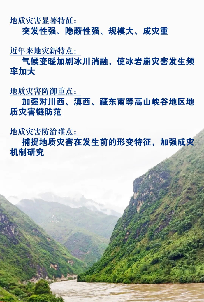 近年来,高山峡谷区受气候变暖的影响,地质灾害也表现出一些新特点。自然资源部驻西藏地灾防治专家组组长、成都地调中心灾害地质环境地质室副主任李宗亮指出,气候变暖加剧了冰川的消融,使冰岩崩灾害发生频率加大,如一些冰岩崩引发的碎屑流、泥石流及堵江灾害近年来已多次发生。与气候变暖有关的地质灾害,还有冰湖溃决形成的山洪泥石流灾害、冻土融化产生的滑坡等。同时,气候变暖还使这些地区降雨增多,使地质灾害发生的频率及规模都有所增加。