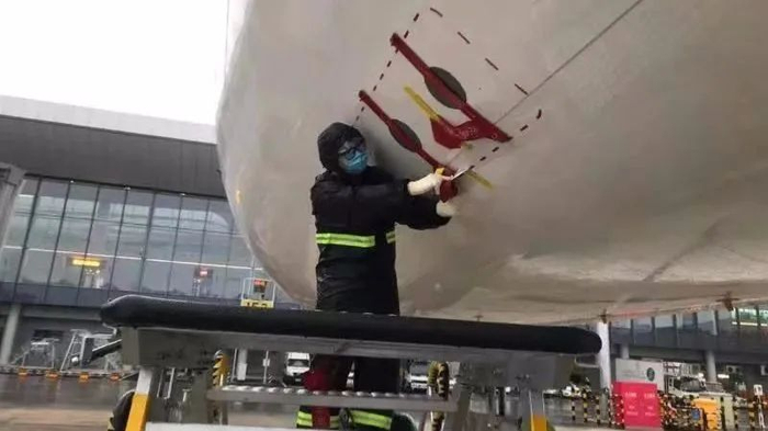 ●暴雨中,机务人员正在为飞机安装静压孔保护盖,防止雨水进入静压孔,对飞行参数造成影响。