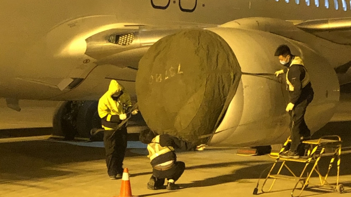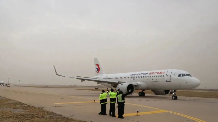 东航技术积极联系各站点,确认发动机布罩数量及可用状态,确保相关人员熟悉使用操作方法,在沙尘来临前实施航空器发动机保护工作。同时,根据航班运行情况再次梳理配备情况,对重点站点进行增配“口罩”。