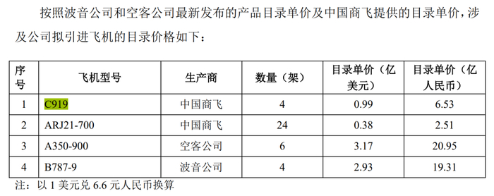 公告披露,中国商飞生产的C919单价为6.53亿元,ARJ21-700单价为2.51亿元。而空客公司生产的A350-900单价为20.95亿元,波音公司生产的B787-9单价为19.31亿元。但需要指出的是,波音和空客两型飞机的航程都在7000海里(约合1.3万公里)以上,机舱座位数量也都明显高于C919。公告同时提到,实际合同价格经订约各方按公平原则磋商后厘定,低于产品目录所载的价格。