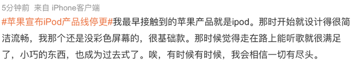 这则消息发布后,在网络上,网友们纷纷表示“爷青结”,有网友称自己最早接触到的苹果产品就是iPod,“那时候觉得走在路上能听歌就很满足了”。不少音乐爱好者纷纷晒出了自己当年购买的iPod产品,追忆那段青春时光。