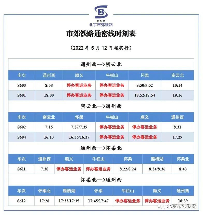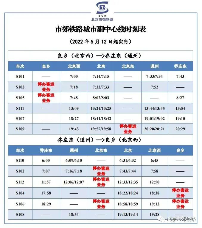 自5月12日首班车起,市郊铁路城市副中心线良乡站、北京东站,通密线顺义站、牛栏山站暂停办理市郊铁路客运业务。