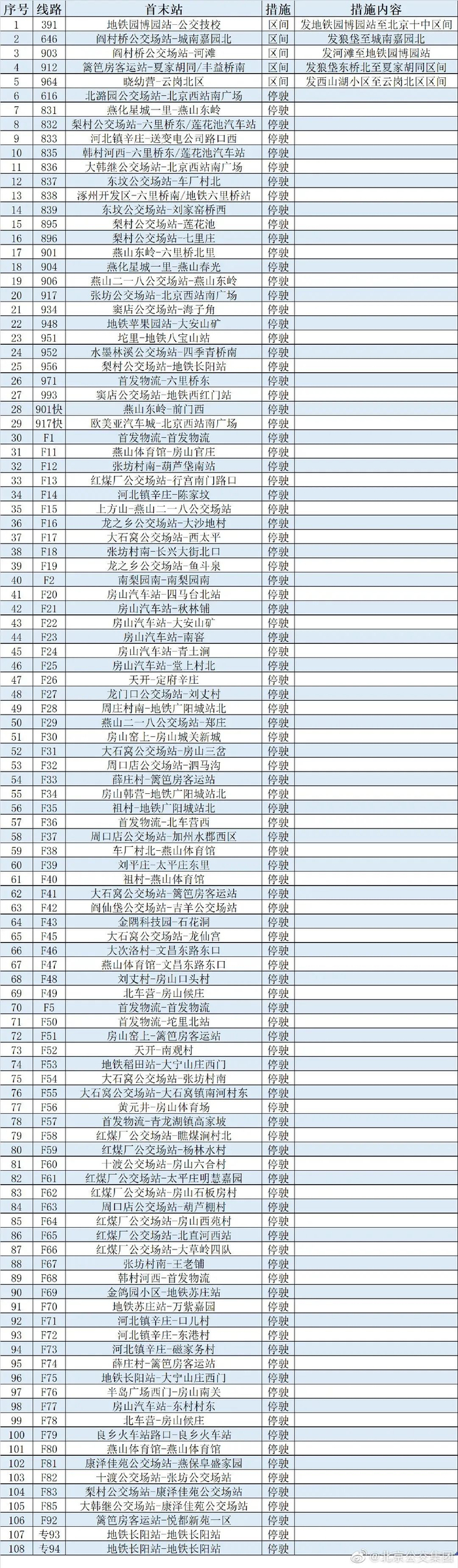 自5月12日首车起,途经房山区的全部108条公交线路,采取区域外区间、停运等措施,其中:停驶措施103条,区域外区间措施5条。