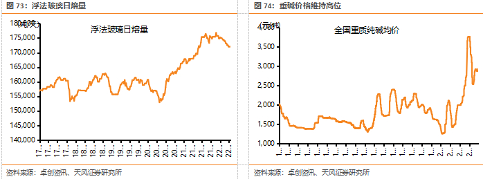 2022年全年供需结构预期偏弱,成本或对价格形成支撑。22Q1浮法玻璃价格冲高回落,整体表现弱势,主要原因有三:1)地产资金改善不及预期;2)供应保持高位,供需矛盾突出;3)社会库存消化缓慢带来的厂家库存积增。全年来看,我们认为需求端或维持去年水平,随着Q2部分运输、终端施工限制等利空因素解除,叠加地产政策宽松,需求或有回暖,资金改善情况将决定回暖程度。供给端来看,根据卓创资讯,2022年计划冷修产线约20余条(截止4月底冷修6条共计3850t/d),计划点火产线14条左右(截止4月底冷修4条共计3350t/d),产能变化弹性较大,利润或将偏低位运行。从行业净利润角度,截至4月28日,周内净利润124元/吨,行业利润微薄,叠加纯碱价格处于高位,我们预计价格仍有支撑。从库存角度,截至4月28日,库存超6000万重箱,处于历史较高水平,对后续价格上涨动能形成一定拖累。