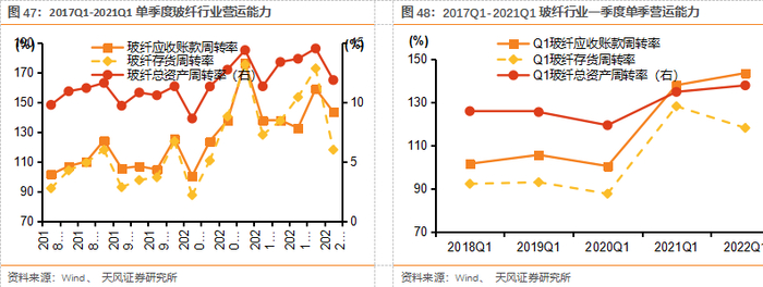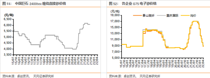 我们认为22年玻纤供需格局基本稳健,全年价格仍有望维持高位。22Q1行业延续高景气,因国内需求强韧性+海外需求超预期增长,价格持续高位。另一方面,22年至今国内部分产线停产冷修,使得供应量局部小幅缩减,且后续冷修或仍有一定压力。根据卓创资讯,截至4月底,大众品种2400tex缠绕直接纱市场价达6075元/吨,同比降125元/吨,G75电子纱价格由于供给冲击回落至20年年末水平,预计后续再降价空间并不大。3月底,国内重点市场样本库存量增加至29.03万吨,环比增加19.12%,同比增加46.87%,主要是产能有所增加且Q1高成本压力下下游采购需求有所抑制。但我们认为展望全年玻纤供需格局或仍将维持稳健:1)受能耗指标及市场价格影响,国内部分产线投产时间或延迟,且国外部分玻纤产线可能关停,全球范围来看,供给端或仍偏紧;2)需求端,海外需求有望持续超预期,国内风电需求或回暖,新能源汽车等领域渗透率持续提升。我们认为22年玻纤供需格局基本稳健,全年价格仍有望维持高位。