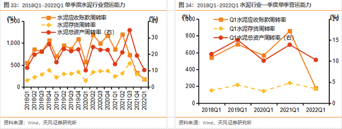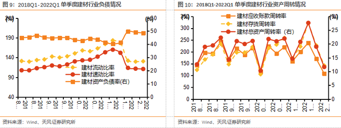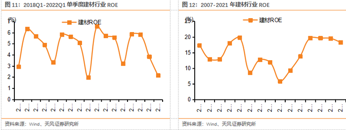2021年行业ROE略有下降,但仍处于高位。2021年建材行业ROE为18.1%,较20年下降1.4pct,仍处历史高位,ROE下降因21总资产周转率指标有所下降,21年应收账款/总资产/存货周转率分别为8.1/0.8/9.5次,同比-0.4/+0.04/+1.0次,应收账款压力略有加大,存货周转速度加快。2022Q1行业ROE为2.1%,同比下降1.1pct,环比下降1.7pct,主要受疫情影响,部分公司营运能力有所下降,由于一季度一般是行业淡季,资产周转率、盈利情况均低于正常水平,预计Q2起ROE或迎恢复。全年来看,我们认为企业回款仍有改善空间,资产周转有望进一步提速,疫情逐渐控制下,盈利能力或有改善,ROE将有望回升。