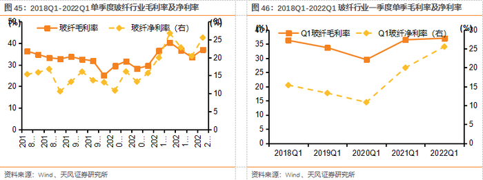 20Q4开始玻纤价格开启上行周期,目前价格仍然处于高位。21玻纤行业单季度收入及利润增速仍保持较高增速,尤其净利增速Q1-Q4均维持在50%以上。我们认为玻纤行业或在逐步进入周期属性明显减弱的阶段,核心主要在于供给端变化,新增供给大幅冲击或成为过去时,主要体现在:1)行业在产产能基数提升,新增供给冲击动能减弱;2)能耗双控背景下,玻纤新增产能落地增加政策扰动变量;3)玻纤协会亦在引导产能有序扩张,思路较十三五期间发生变化。另一方面,需求短期有弹性(22年期待出口、汽车),同时我们对其成长持续性(风电纱、新能源汽车渗透率提升等)较为乐观。