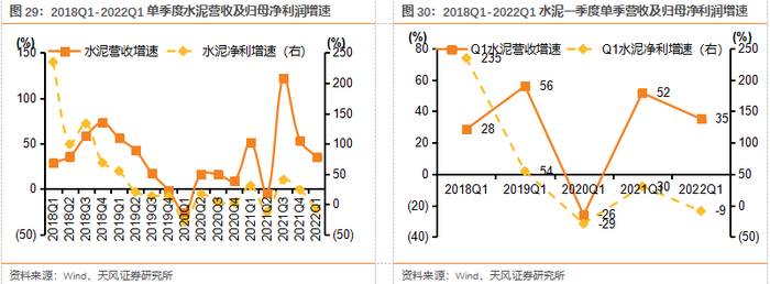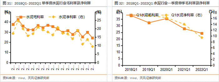 2021年玻纤/玻璃建材归母净利润增长较快。2021年玻纤、玻璃、水泥排名前三,归母净利润分别同比+100.0%/+83.9%/+16.3%。玻纤/玻璃行业同比增速较快,主要系全年均价高位所致,玻纤下游需求较为景气(风电及海外需求超预期),玻璃由于结构性供需失衡导致21H1价格涨幅较大。水泥和消费建材净利增速低于营收增速主要由于原材料及燃料价格的上升所致,消费建材企业减值计提也较大。22Q1各子板块净利润除玻纤外均同比下降,玻纤同比增速为55.7%,主要是因玻纤与地产联系较弱;Q1由于地产资金链尚未完全缓解,下游开工率较低,加之3月以来疫情对发货运输均有影响,同时成本价格虽有下降仍维持高位,地产链相关的玻璃、消费建材归母净利同比降幅均较大。
