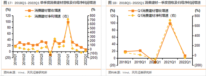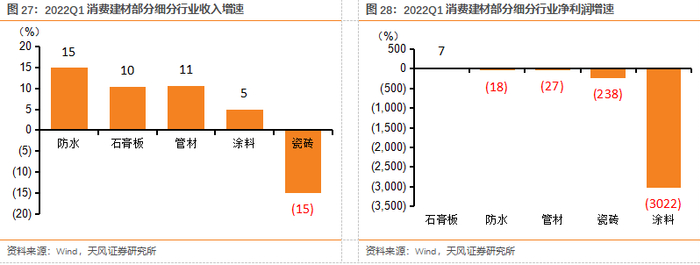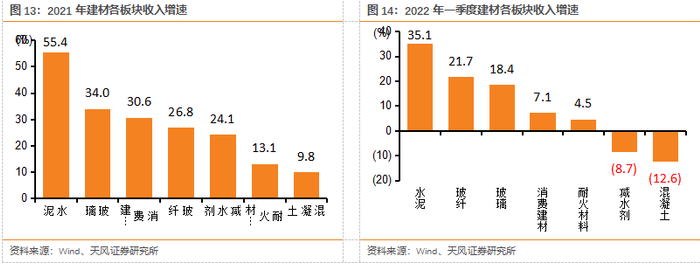 (1)防水:防水行业21年收入/利润增速+41%/+9%,21H2防水行业受到地产新开工大幅下行影响,行业盈利能力较差。21年末行业内公司不断通过冬储低价沥青+产品提价来对冲原材料上涨压力,截止22年3月,雨虹已经对部分主营产品进行提价。我们判断后续地产政策端的回暖有望逐步向基本面端转化,22Q2起地产前端数据或触底回暖,同时,防水新规临近落地、屋顶光伏快速增长也有望带来新增量。