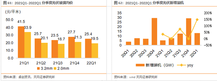 22年4月份光伏玻璃价格开始推涨,Q1光伏装机大幅增长。截至4月28日,2mm光伏镀膜玻璃价格为21.21元/平方米,3.2mm光伏镀膜玻璃价格为27.5元/平方米,年初至今涨幅分别为1.2、2元/平米;厂商库存天数16.20天,连续一个月下降。1-3月份国内光伏新增装机量13.2GW,同比增速147.8%,未来若上游原材料价格回落,中长期光伏装机需求22/23年有望持续改善。