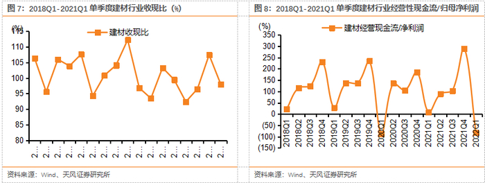2021年收现比基本稳定,经营现金流/净利润有所上升,整体盈利质量仍保持良好。2021年行业平均收现比为99.4%,同比下降0.7pct;经营性现金流/归母净利润129.1%,同比上升8.2pct,整体盈利质量有所上升,主要系部分企业加强收款管理,经营性现金流有所改善,整体来看,建材行业盈利质量仍保持良好。