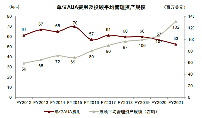 薪酬支出为费用端主要构成,非薪酬支出的控制效果显现。公司FY21营业费用同比增长15%至80亿美元、FY12-FY21复合增速达10%,营业费用率由FY12的88%下降6ppt至FY21的82%,具体来看,1)营业费用的83%来自于薪酬支出,近五年来公司薪酬费用率基本稳定在~67%,主要由于公司主营业务依赖于高素质的投资顾问团队,而顾问的薪酬激励与资产管理规模及业绩表现挂钩;2)非薪酬费用主要包括设备及技术支出、业务发展费用、专家费用等,近五年来(除FY21)公司非薪酬费用率基本稳定在~18%,FY21同比下降4ppt至14%、公司非薪酬支出的控制效果显现。