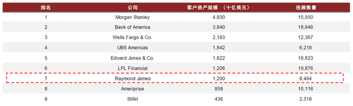 资料来源:公司公告,中金公司研究部;注:数据截至2021年12月31日;瑞杰金融采用财富管理部门的客户管理资产及投顾数量;摩根士丹利为财富管理部门客户资产,因2021年报未披露投顾数量、采用2020年报数据;美国银行为财富管理部门和私人银行合计;富国银行为财富和投资管理部门合计;UBS Americas为全球财富管理部门美国地区口径;Edward Jones为公司口径;LPL为咨询和经纪业务口径;Ameriprise为咨询和财富管理部合计;Stifel为全球财富管理部门口径