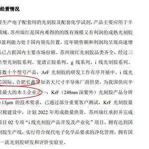 据了解,苏州瑞红光刻胶品类齐全,经过三十年积累,拥有负型光刻胶系列、宽谱正胶系列、g 线系列、i 线光刻胶系列、 KrF 光刻胶系列等数十个型号产品,ArF 光刻胶的研发工作有序开展中。i 线光刻胶已向国内中芯国际、合肥长鑫等知名大尺寸半导体厂商供货,为我国供应半导体光刻胶出货量最大的本土企业之一;KrF(248nm 深紫外)光刻胶产品分辨率达到了 0.25~0.13μm 的技术要求,已通过部分重要客户测试,KrF 光刻胶量产化生产线正在积极建设中,计划 2022 年形成批量供货。苏州瑞红承担并完成了国家重大科技项目02专项“i 线光刻胶产品开发及产业化”项目,拥有达到国际先进水平的光刻胶生产线,实行符合现代电子化学品要求的净化管理,拥有国家02专项资助的一流光刻胶研发和评价实验室。