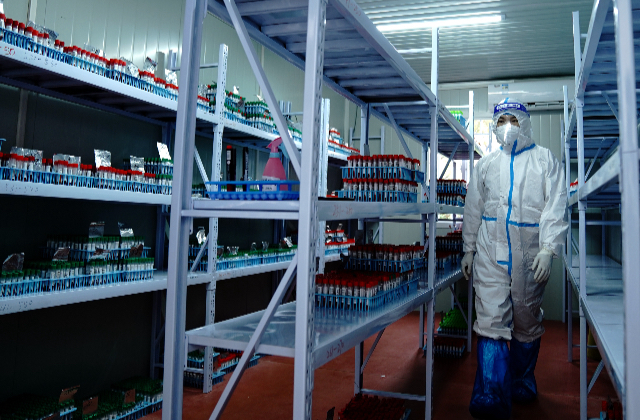 4月15日,工作人员在核子华曦核酸检测方舱实验室的样本暂存间忙碌。新华社