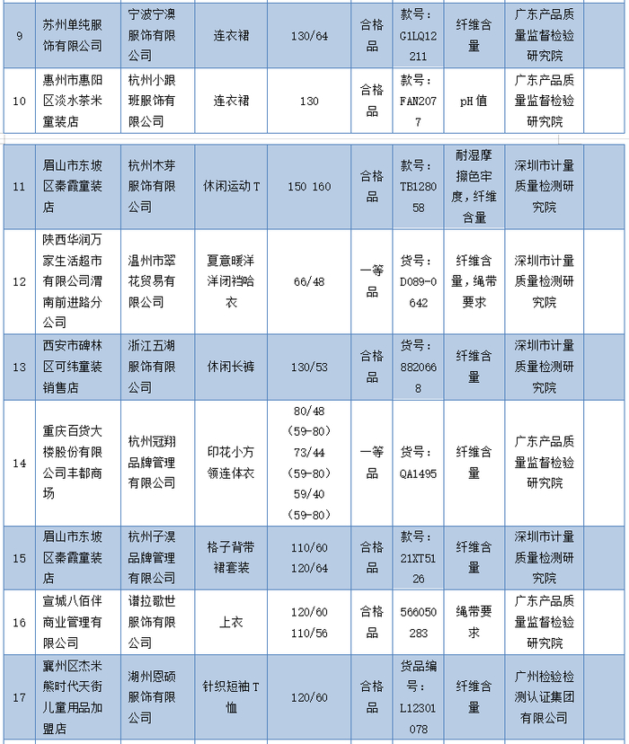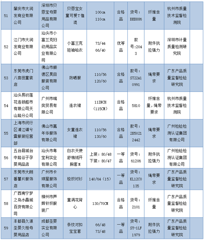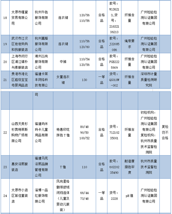 不合格项目涉及pH值、耐唾液色牢度、耐湿摩擦色牢度、纤维含量、附件抗拉强力和绳带要求。