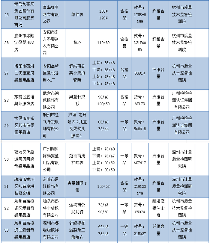 本次抽查在流通领域开展抽样,抽查了18个省(区、市)382家企业生产的395批次儿童及婴幼儿服装产品,发现59批次产品不合格,抽查不合格率为14.9%,不合格产品中,1批次产品涉嫌假冒。该产品近3次抽查不合格率分别为13.2%、16.4%、14.9%。