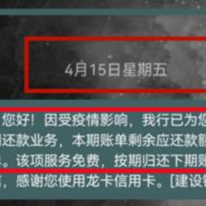 多名持卡人向「支付百科」反映,最近收到了建设银行发送的短信信息,短信的内容为:“因受疫情影响,建设银行已为本期账单提供了延期还款业务,本期账单剩余应还金额已归入下期账单,该项服务免费,按期归还下期账单不会影响征信。”据了解,建设银行从4月份就在主动联系持卡人。