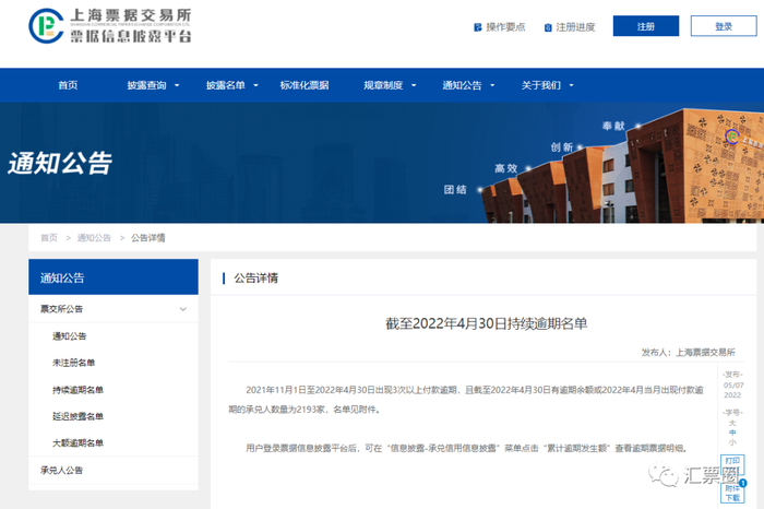 近日,上海票据交易所公布了截至2022年4月30日的商票持续逾期名单,?2021年11月1日至2022年4月30日出现3次以上付款逾期,且截至2022年4月30日有逾期余额或2022年4月当月出现付款逾期的承兑人数量为2193家。其中,富力地产集团有限公司、绿地控股集团股份有限公司、弘阳置地(集团)有限公司、建业住宅集团(中国)有限公司、厦门大唐房地产集团有限公司、领地集团有限公司等均在名单之列。另有285家已从名单中去除。