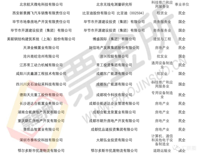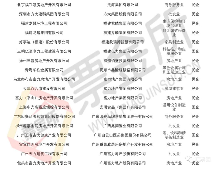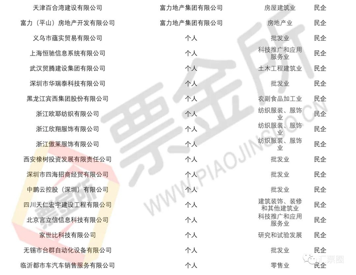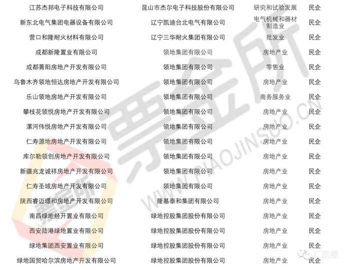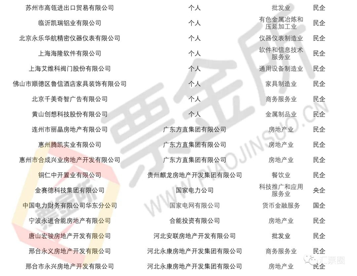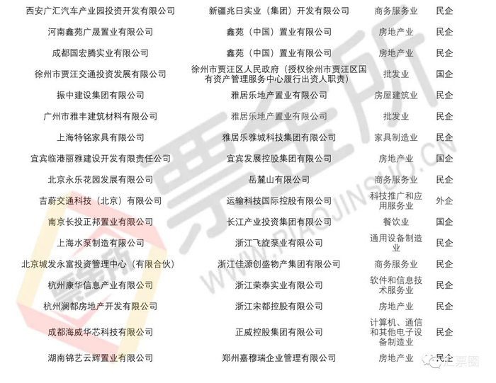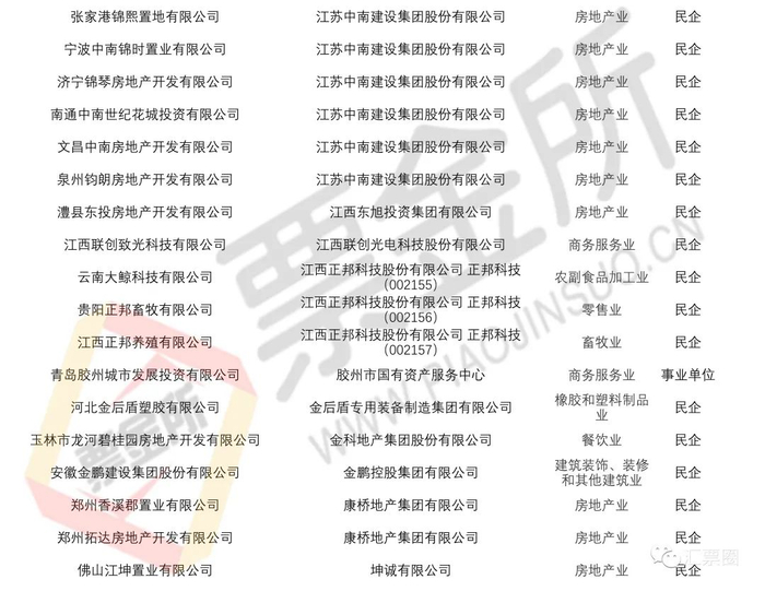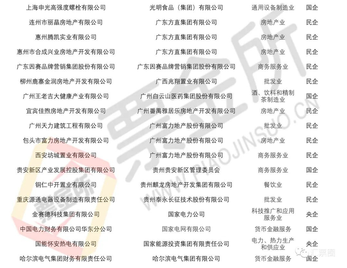 新增主体中,涉及多个行业,包含多家国央企和知名民企,如:安徽建工、宝龙地产、保集控股、比亚迪、财信地产、泛海集团、方大集团、富力地产、光明食品、白云山医药、雅居乐、航天工业、宾西集团、恒大农牧、正邦科技、上海地产、正业科技、中国一重、远大铝业、佳源、中国动力、中国电气装备、中国电信、葛洲坝、国家铁路集团、中国航发、华电集团、金茂、中海物业等。