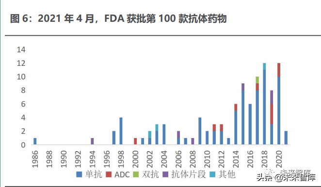 复盘抗体药物的崛起之路,mRNA 作为颠覆性技术有望成就下一个万亿市 场。RNA 是一项跨时代的生物技术,给很多领域带来了新的革命性的治疗方法, 我们类比同样给医药领域带来重大改革的抗体技术,从抗体药物的获批情况来看, 大体分为三个阶段 1)1986-1996 年蛰伏期,1986 年出现了第一个获 FDA 批准的单抗药物, 之后鲜有相关药物获批,行业技术处于储备阶段;2)1997-2013 年爬坡期,期间平均每年有 1.65 款抗体药物获批,趋势较 为平稳;3)2014 年至今快速发展期,截至 2021 年 4 月,有 65 款药物在此期间获 批,且每年获批数量仍呈现上升趋势,目前总计获批的抗体药物数量超过 100 款, 而且这一数字还在不断增加,现在每年获批的抗体类药物已经占 FDA 新药的近 五分之一。