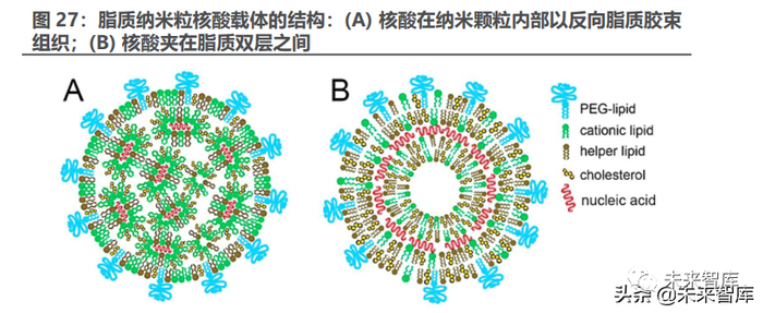 (2)国产 LNP 生产厂商逐步掌握产业先进技术 目前 LNP 中含有可电离的 阳离子脂质(ionizable lipids),胆固醇(Cholesterol)、辅助磷脂(Helper lipid),聚乙二醇修饰的磷脂(PEG- lipid)、带负电的 mRNA。