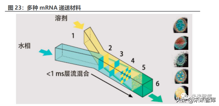 以目前行业龙头 Precision NanoSystems 的微流控方案为例,其利用芯片 控制的微流控装置,将包好 RNA 的液相层与载体的溶剂层混合两股层流混合, 利用可控制速度装有混合器的微通道实现快速扩散,极性变化,并且在界面层表 面实现 mRNA-LNP 的自组装。该方法通常能够实现均一化的制剂构成,是一种 球形和多层脂质体结构。相比较其他方法,微流控方法整体重现性较强,能够有 效加强分子稳定性,降低了污染的可能性,有助于临床前和临床阶段研究的放大 生产。