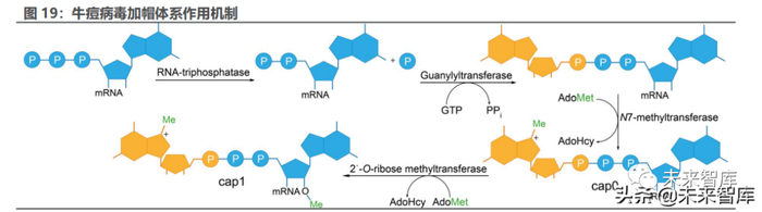 在两步法酶法加帽中,利用牛痘病毒加帽酶将 7-甲基鸟苷帽结构(m7Gppp, Cap 0)加到 RNA 的 5' 末端,其结构中包含两个亚基 (D1 和 D12),具有三种酶 活性 (D1 亚基具有 RNA 三磷酸酶和尿苷转移酶活性;D12 亚基具有鸟嘌呤甲基 转移酶活性)。首先 RNA-三磷酸酶将 pre-RNA 的γ-磷酸水解,随后尿苷转移酶 以 GTP 为底物形成共价酶-(赖氨酰-N)-GMP 中间体,最后 RNA(鸟嘌呤-N7) 甲基转移酶以 AdoMet 为底物将 N7 位甲基化。